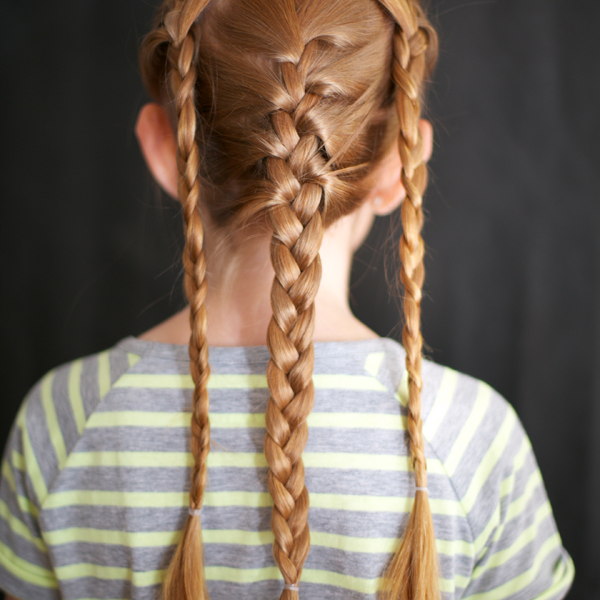 Първото, което трябва да направите е да разделите косата си на три части. След това хванете лявата част и започнете да сплитате нормална плитка, нищо специално. Особеното тук е, че плитката трябва да започва още от предната част на косата, за да я обхване цялата. След като сте я изплели докрай я завържете с ластиче. Направете същото и с дясната част от косата, а най-накрая и със средната. Трябва да имате три големи плитки.